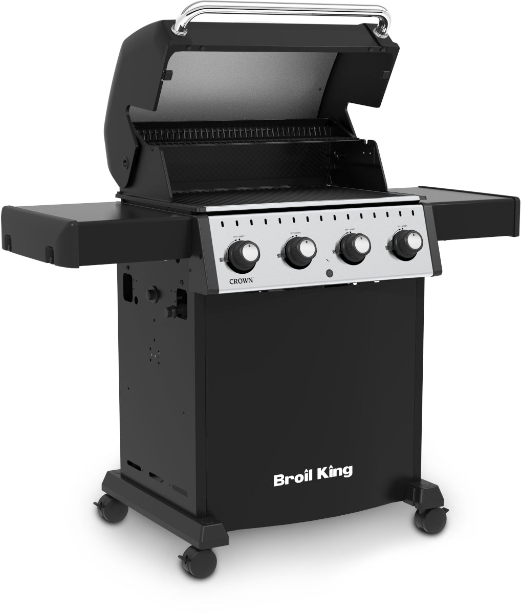 The Crown 400 Series features 2,865 sq. cm primary cooking surface and includes 4 stainless steel tube burners, 10 mm reversible cast iron cooking grids, stainless steel Flav-R-Wave cooking system, and electronic ignition. The 400 series features black powder coat drop-down side shelves, frame and front panel.