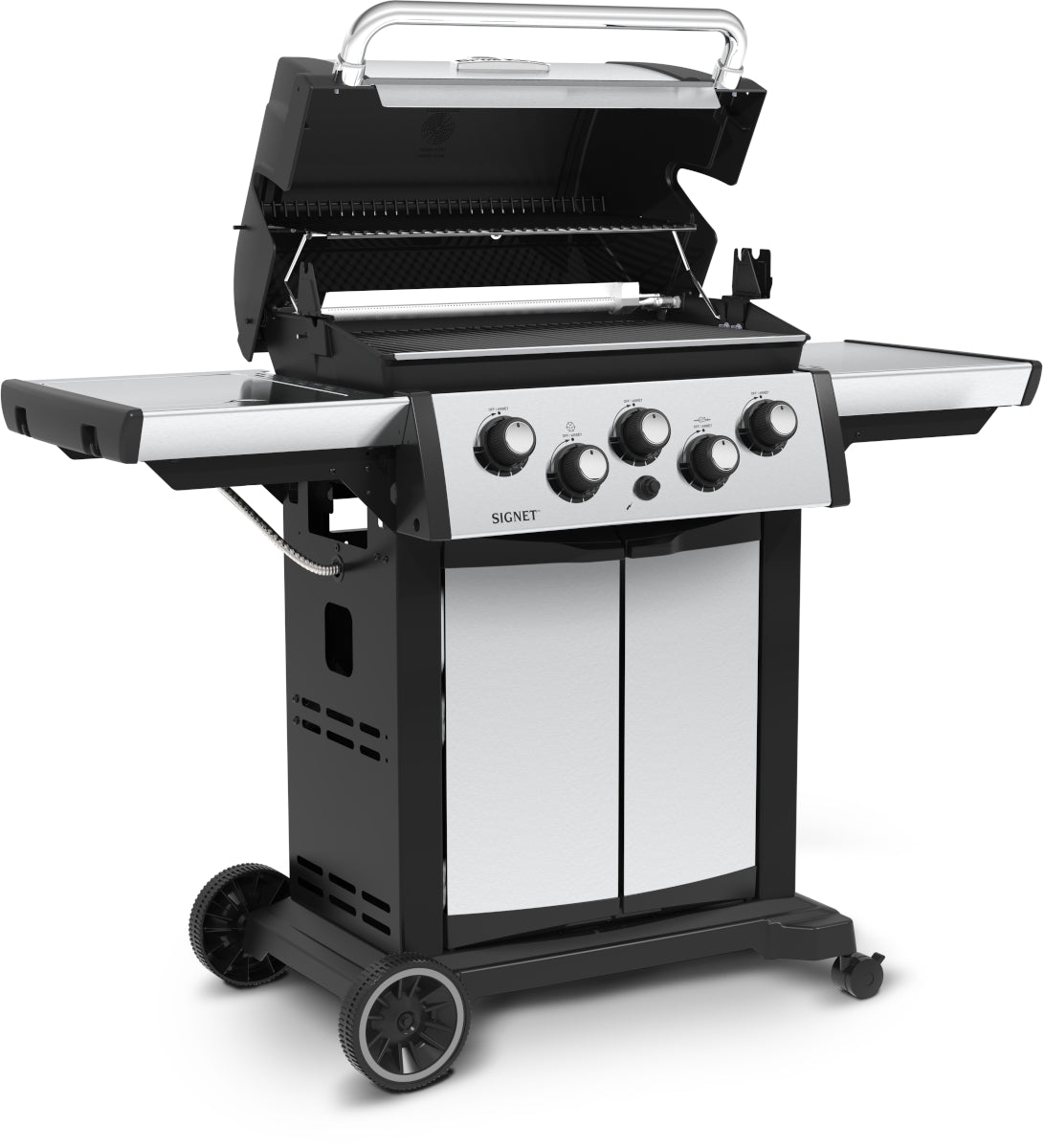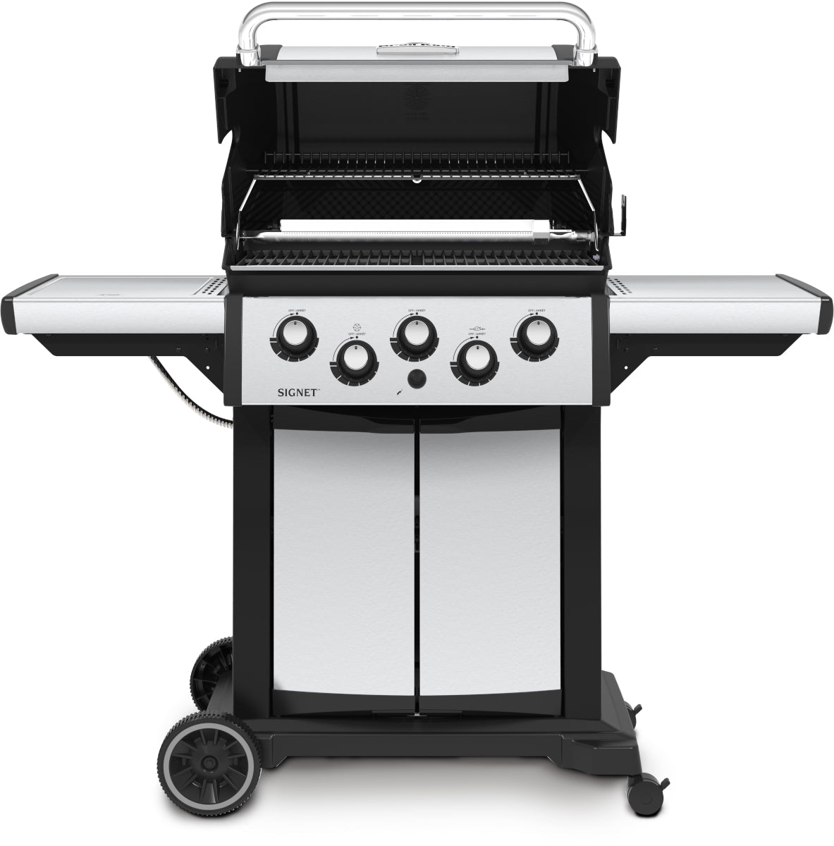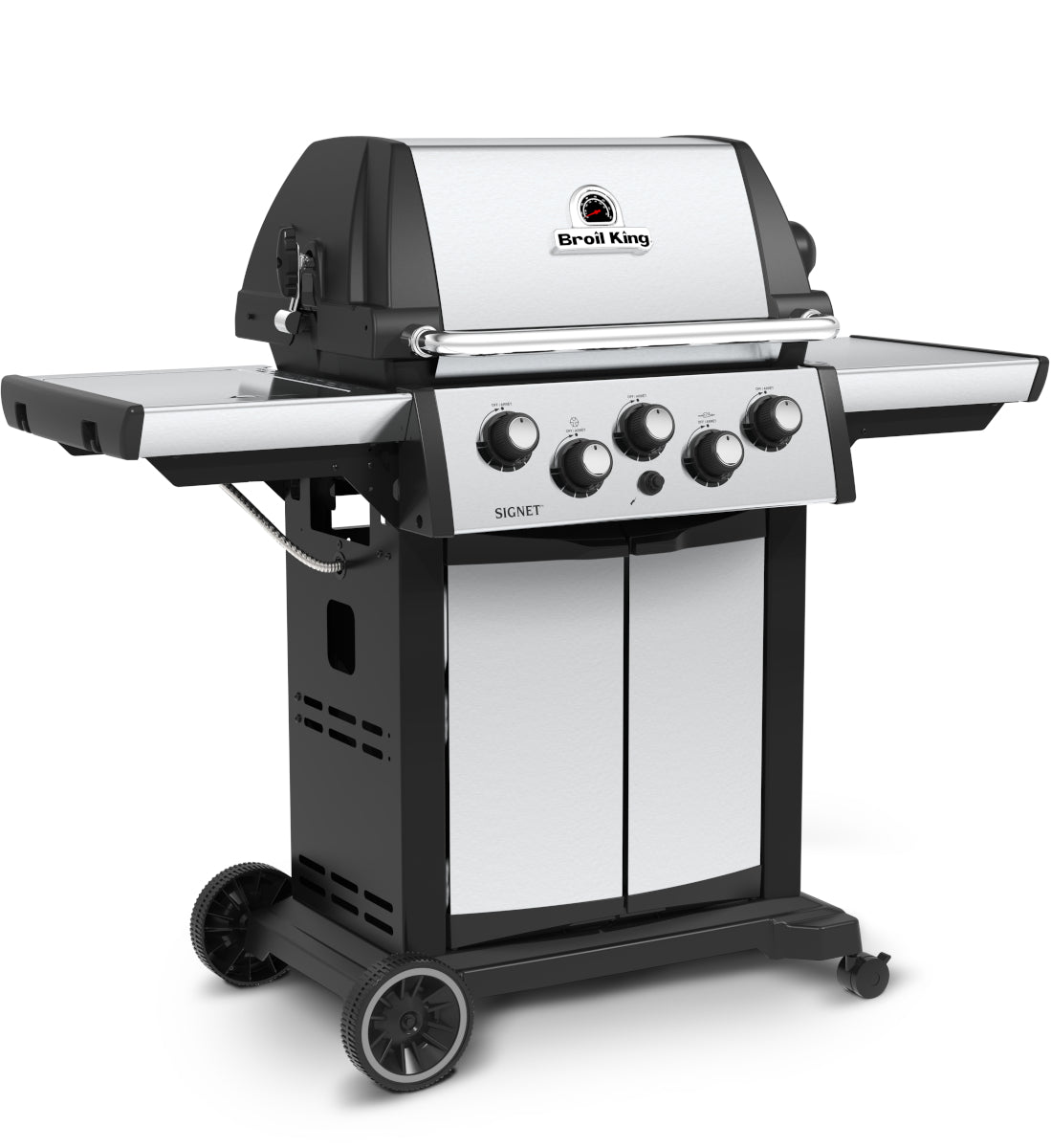 The Signet Series features 2,850 sq. cm primary cooking surface and includes 3 stainless steel Dual-Tube burners, reversible heavy-duty cast iron cooking grids, stainless steel Flav-R-Wave cooking system, and electronic ignition. The Signet series features steel drop-down side shelves, and fully enclosed cabinet base.